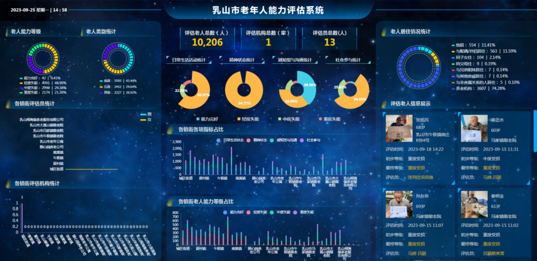 老年人能力评估系统。专业评估员采用电子化、留痕化方式,从老年人日常生活活动能力、认知能力、精神状况与社会交流能力等维度鉴定老人身体状况,评估老人失能水平分值,出具《老人能力评估报告》。严格评估过程管理和数据存储,对评估进行留痕管理,实现信息永久存储、调取、汇总和管理。