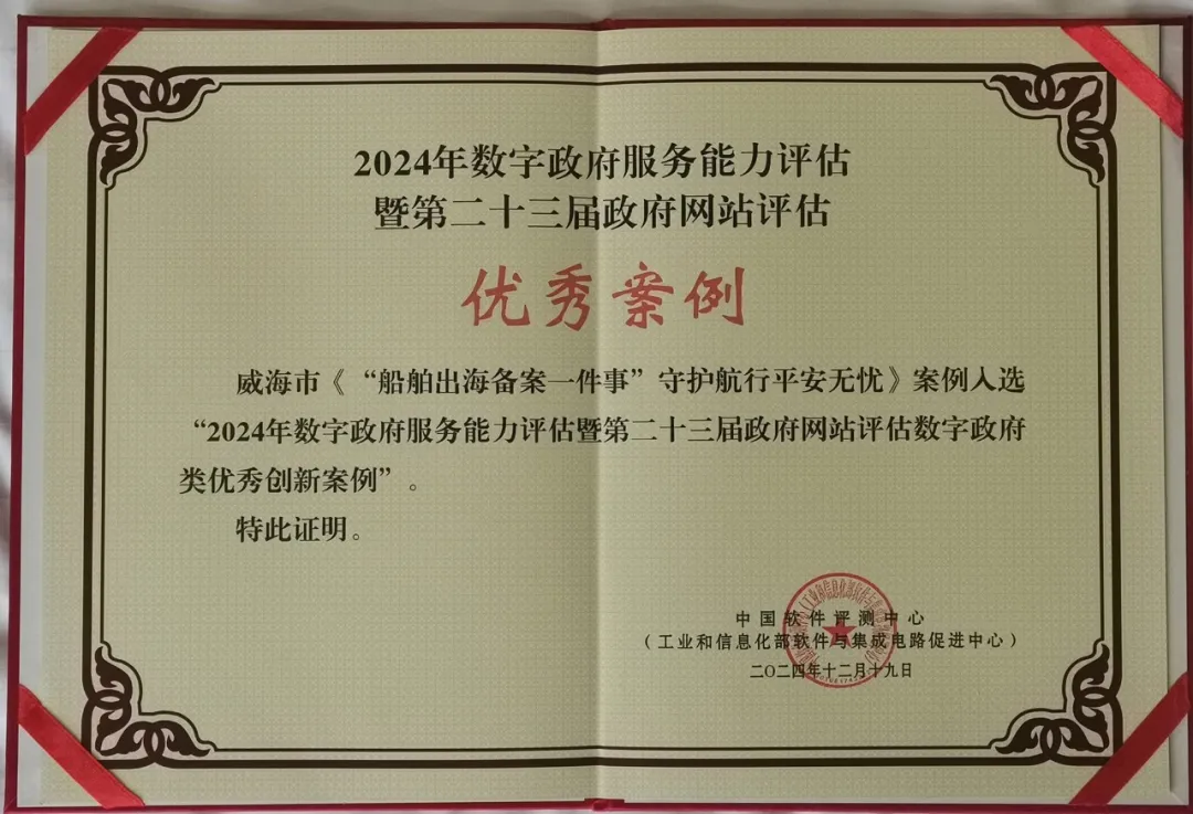 12月19日,由中国电子信息产业发展研究院指导、中国软件测评中心主办的“2024年数字政府评估大会”在北京举行。会上发布了2024年数字政府服务能力评估结果和第二十三届政府网站绩效评估结果,威海市《“船舶出海备案一件事”守护航行平安无忧》《乳山市惠民便企“亲感知”的信用管理模式》入选“数字政府类优秀创新案例”,威海市政府门户网站排名位列全国地级市第11位、全省地级市第1位。