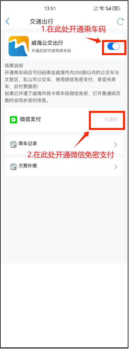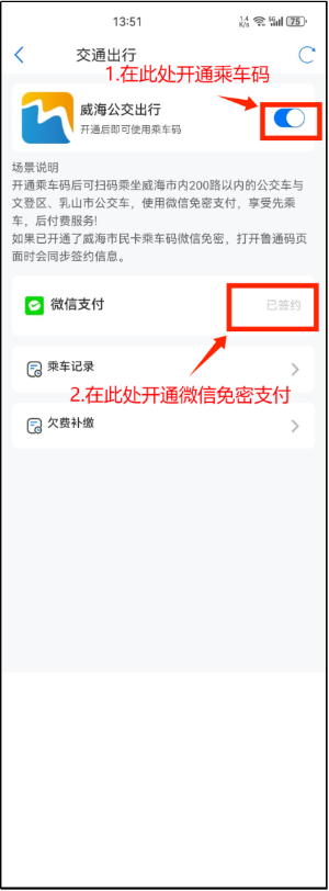 2.点击开通按钮,选择微信支付进行免密签约,即可开通公交乘车功能。如果已开通过威海市民卡乘车码的微信免密,打开“鲁通码”页面时会同步签约信息。