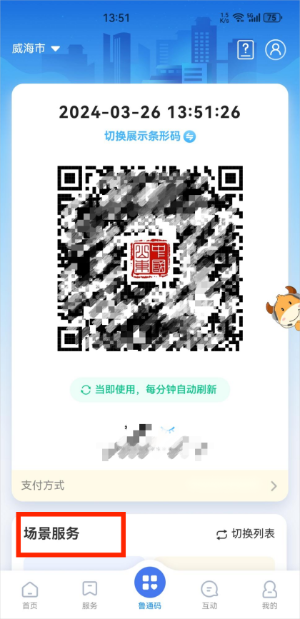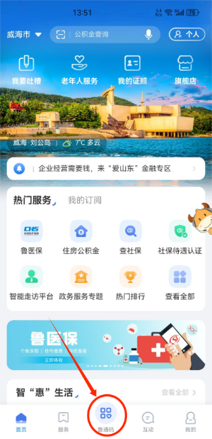 1.市民朋友们打开“爱山东”APP,在首页左上角选择进入“威海市”,然后点击“鲁通码”页面,在场景服务中选择“交通出行”。
