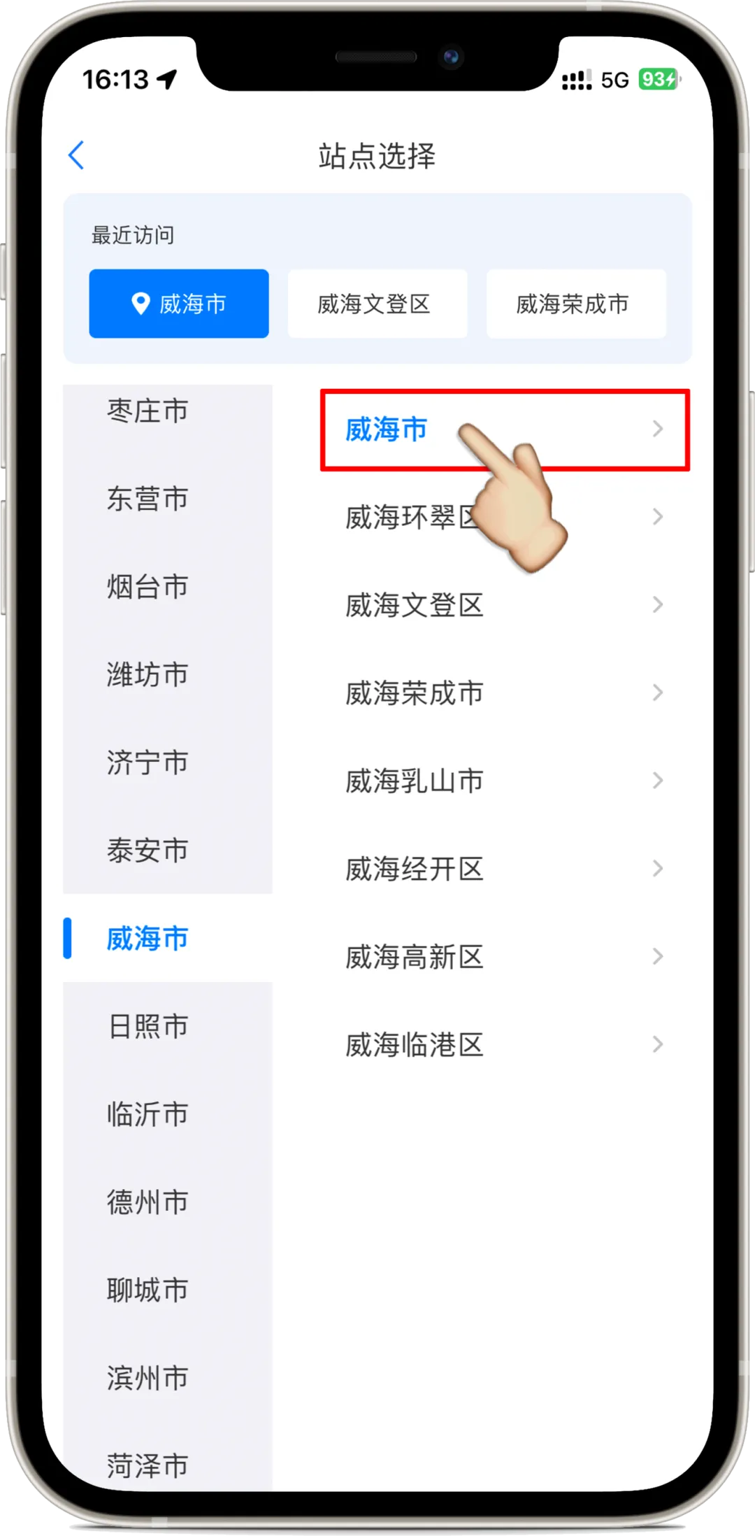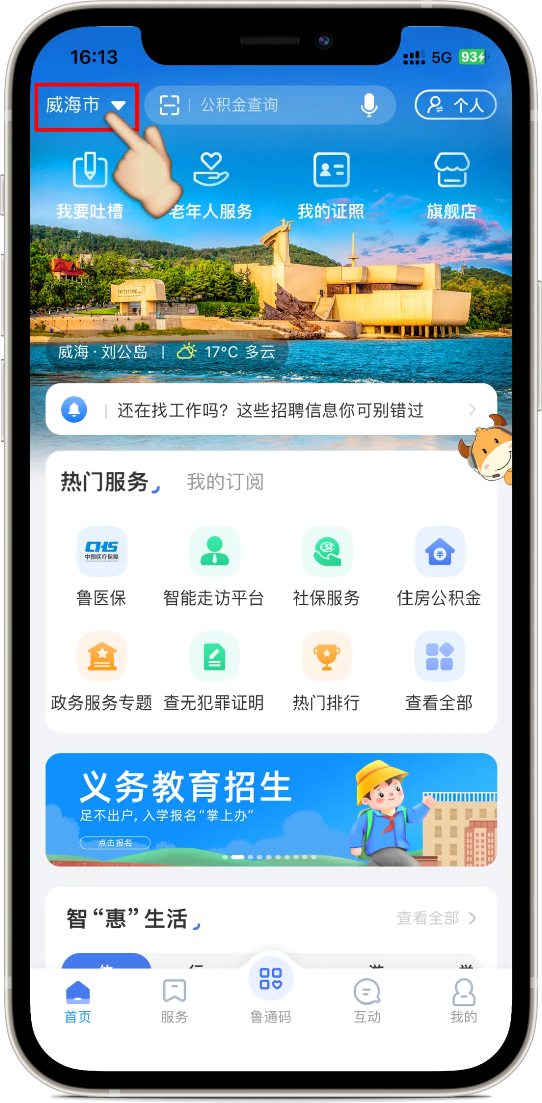 1.打开“爱山东”APP,在首页左上角选择进入“威海市”。