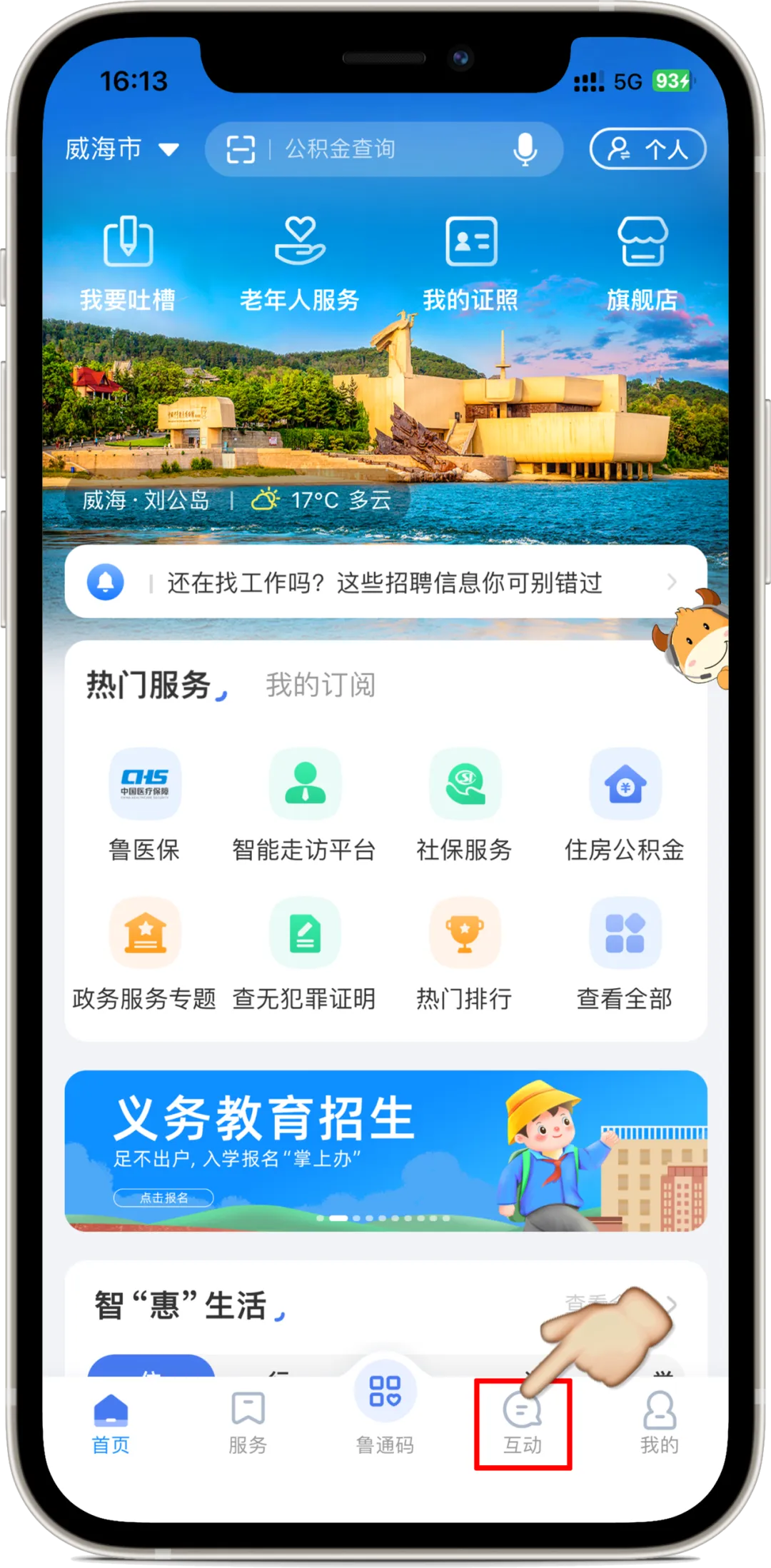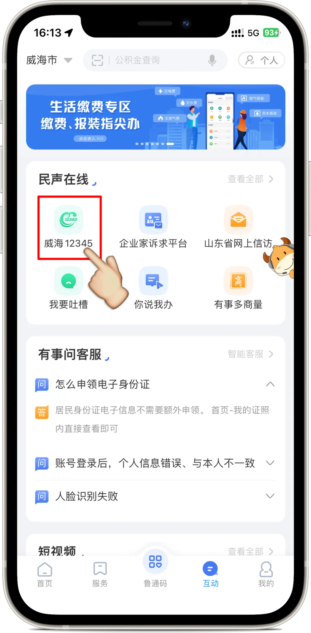 2.点击下方导航栏中的“互动”版块,进入“民声在线”-“威海12345”服务,注册并登录山东省统一身份认证账号。(*已登录用户可跳过此步)