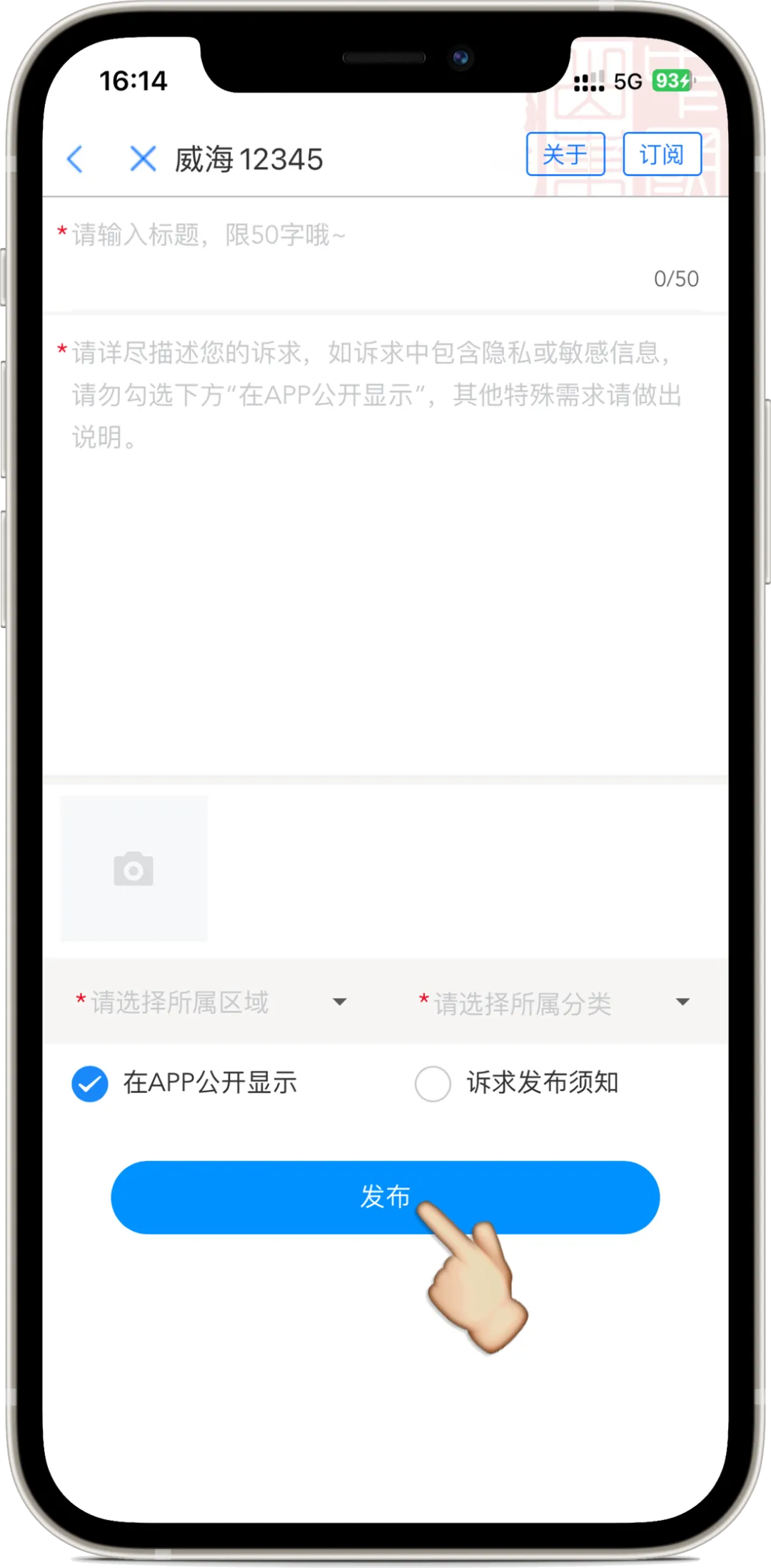 3.点击“诉求受理”-“发布诉求”进入发布诉求页面,按要求填写标题和详细诉求内容,同时可以选择补充相关图片内容进行补充。(*最多可以上传3张)