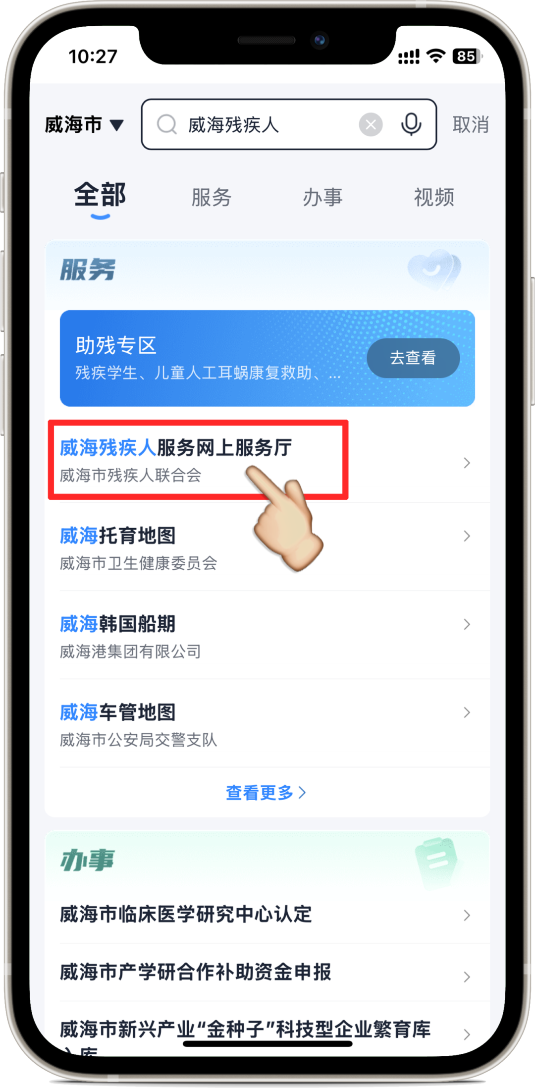 1.打开“爱山东”APP,在首页左上角选择进入“威海市”。在首页搜索栏输入关键词“威海残疾人”,点击进入“威海残疾人服务网上服务厅”。