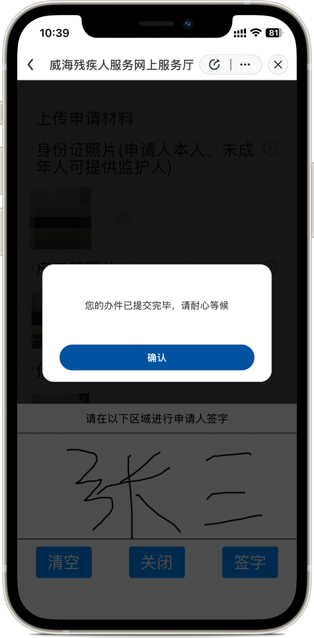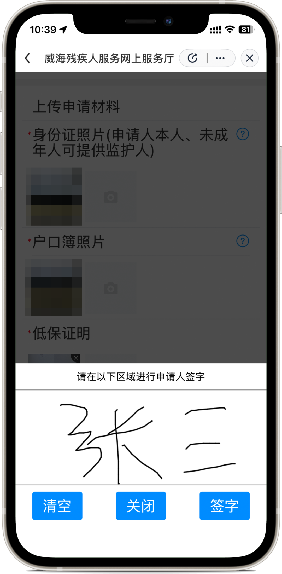 3.根据要求完整填写相关信息后,点击“申请人签字”按钮进行电子签名,完成办件提交。