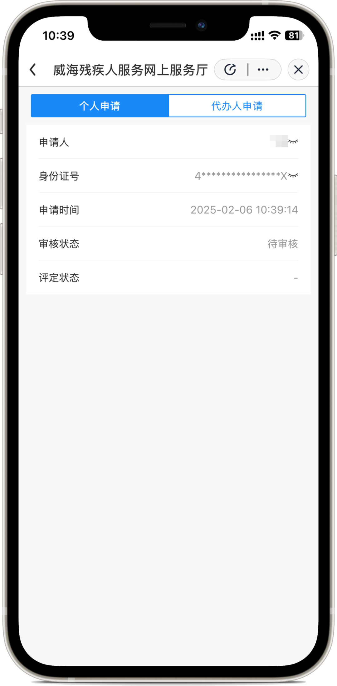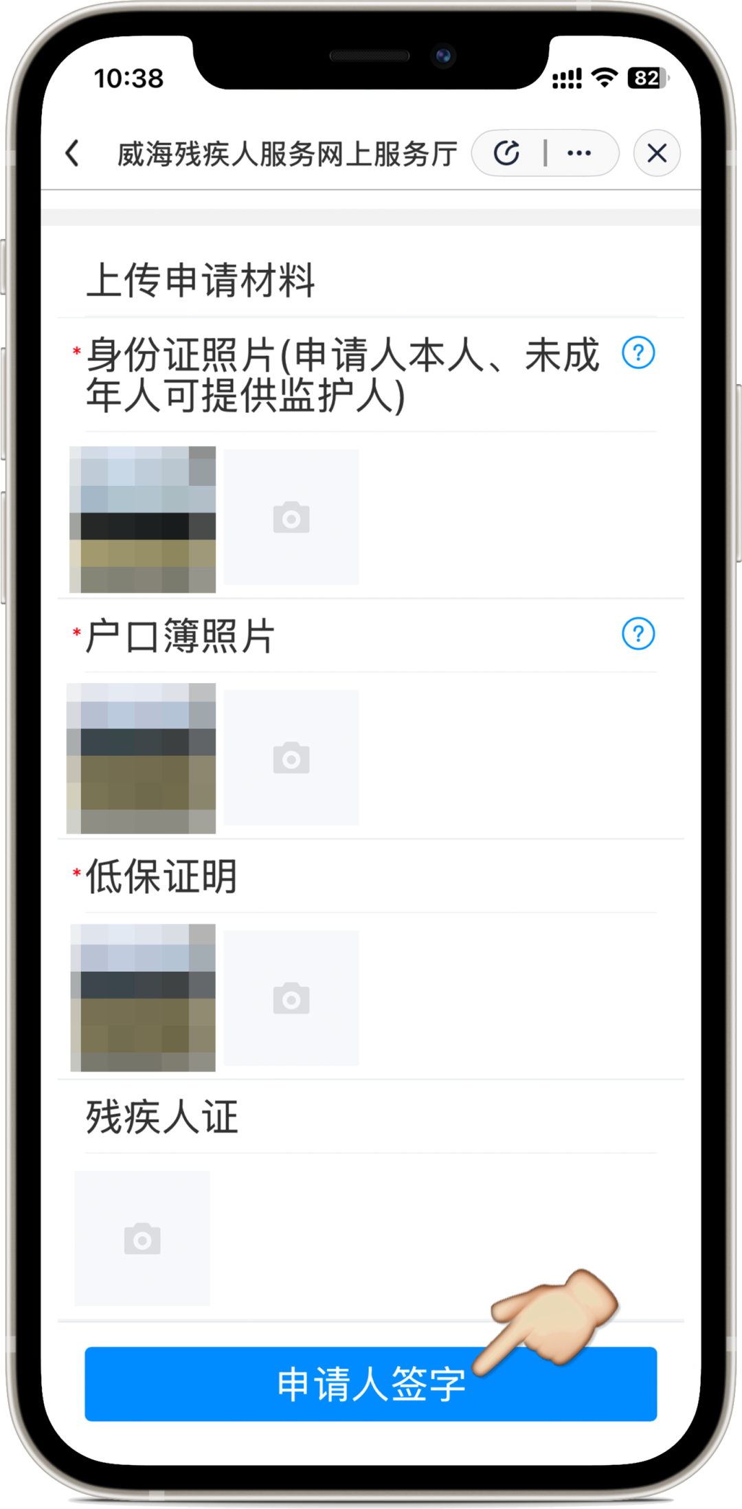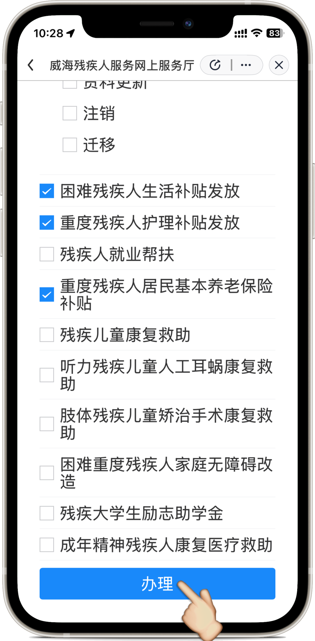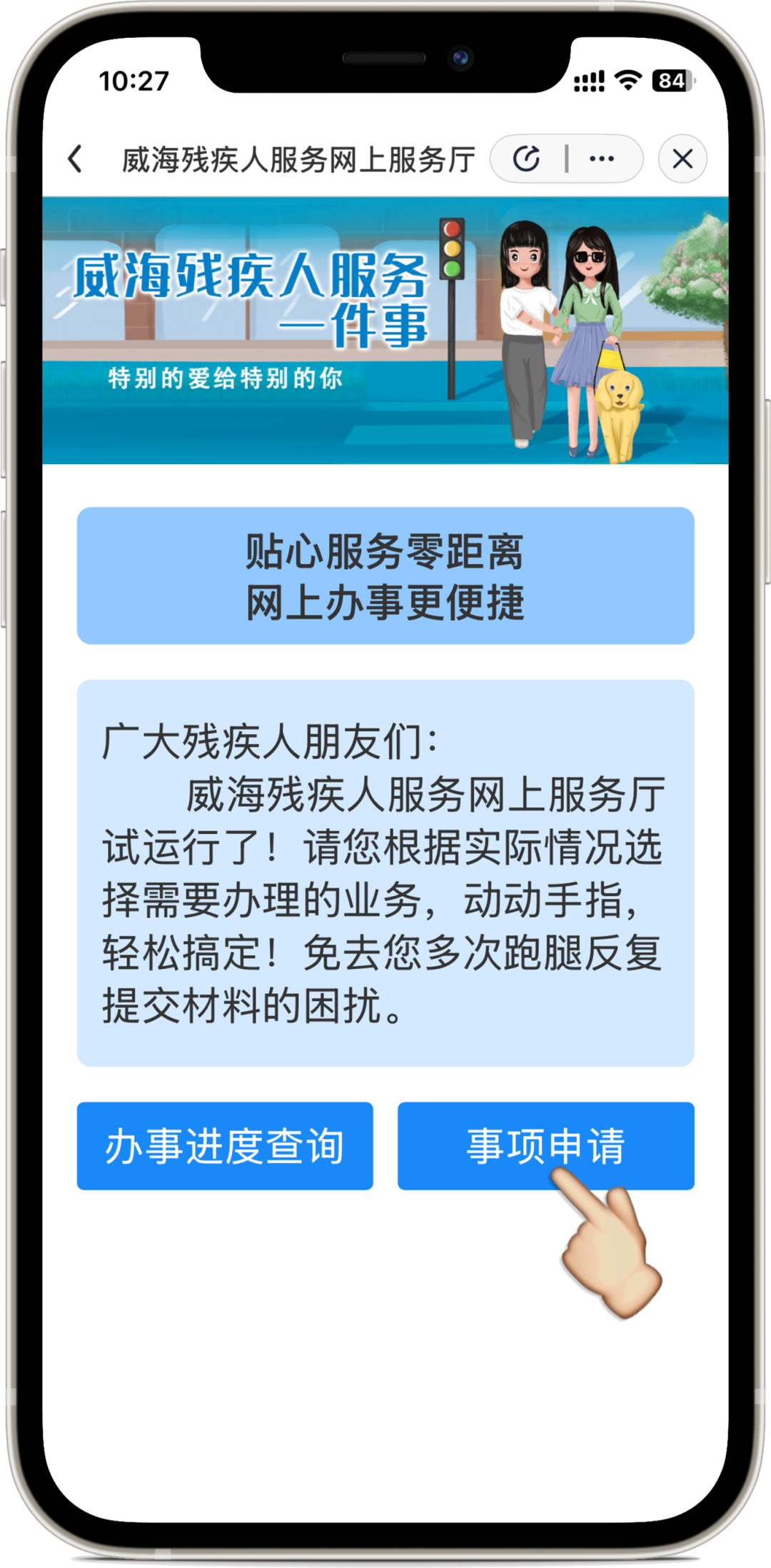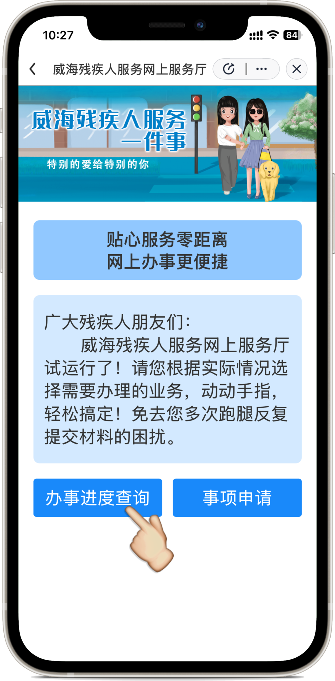 4.提交办件后,即可在“威海残疾人服务网上服务厅”服务首页点击“办事进度查询按钮”查看办件状态。