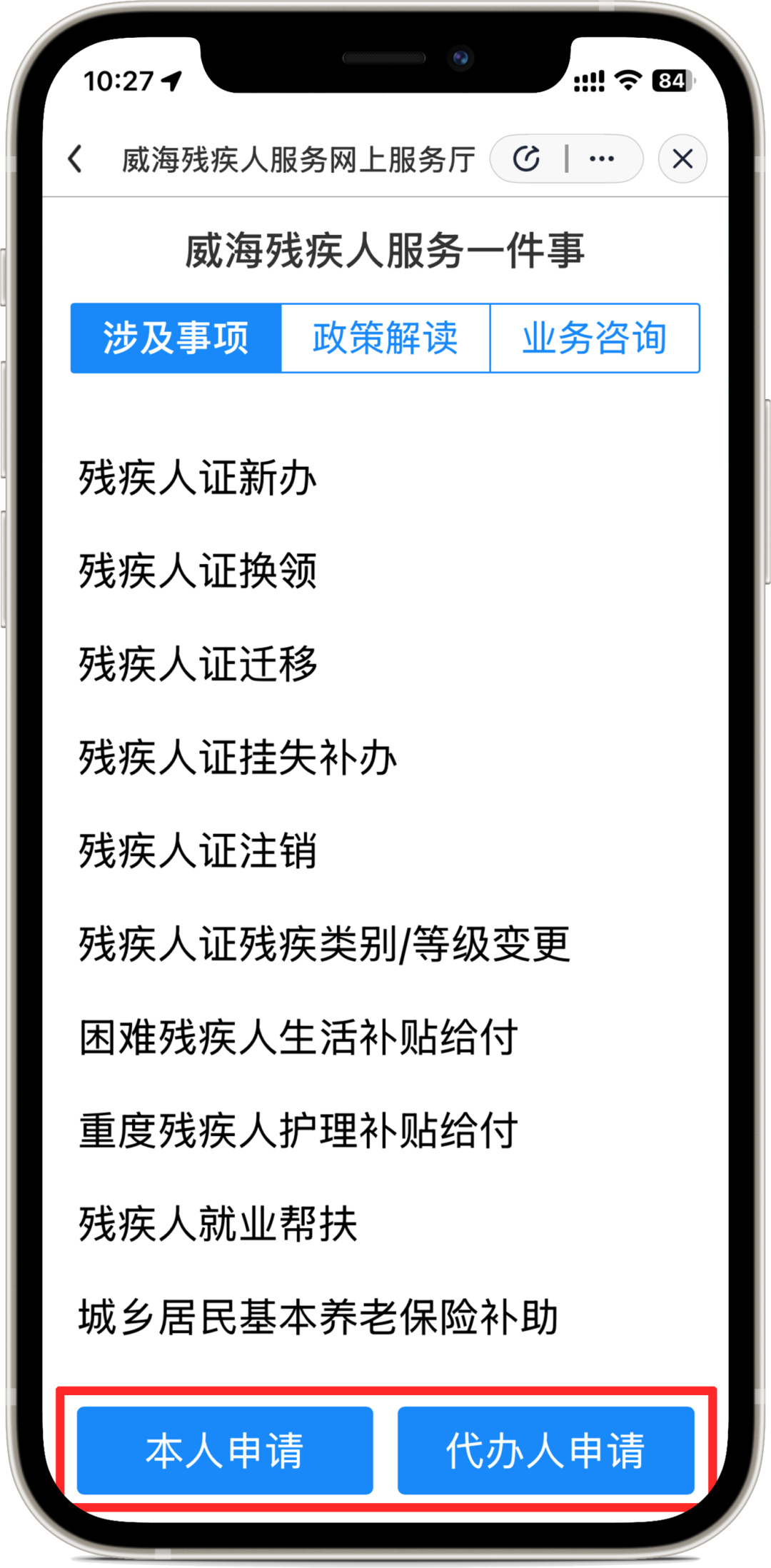 2.首次办理相关业务,点击“事项申请”按钮即可进行个性化选择办理,根据具体办理需求可选择“本人申请”和“代办人申请”两种情形。
