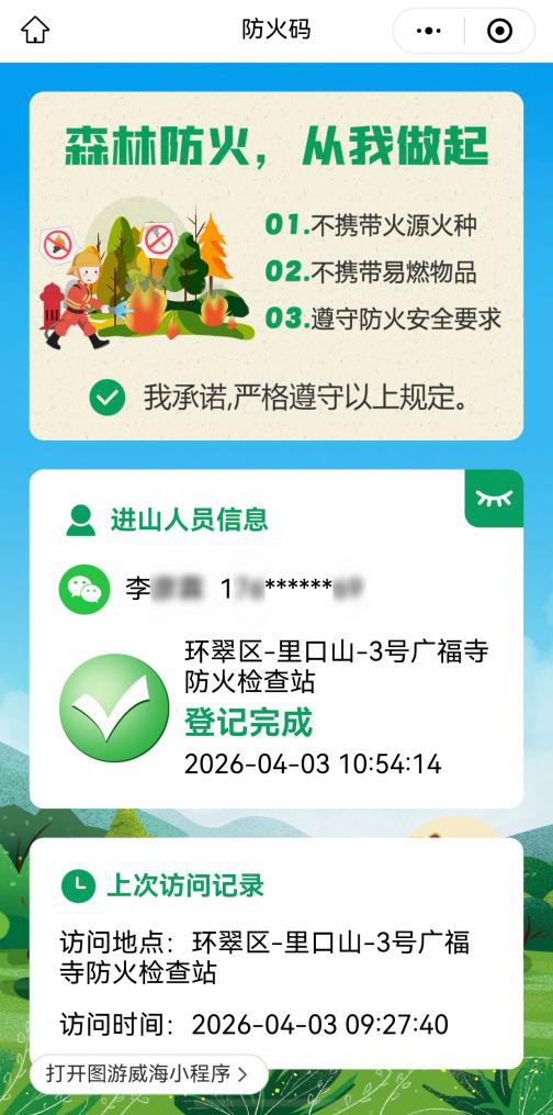 市民进入卡口时,可通过微信“扫一扫”或“爱山东”APP扫码,系统将自动调用经本人授权的基础信息,无需手动填写即可实现快速登记。登记完成后,即时弹出图文并茂的森林防火安全提示,涵盖火源管控、应急避险等须知内容,强化市民防火意识。